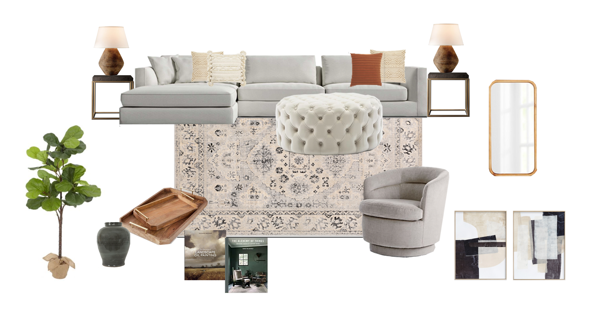 This is the fun part, you get to start shopping but not buying anything quite yet. Start pulling items that you think you would like to use in your space. I like to start with one main piece like the rug or if the client had a dark blue velvet sofa in mind or bold art, I would start with that. Then I begin pulling the other items that are needed in the space and place them on a mood board to see how they work together. I do this in Photoshop but you could just as easily do this with Canva which is free to use. Once you place items together on your board you can get a good sense of what is working and what isn’t. This is such a valuable tool to produce a cohesive design.