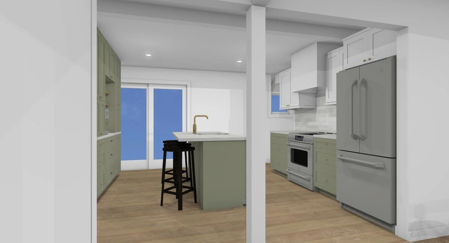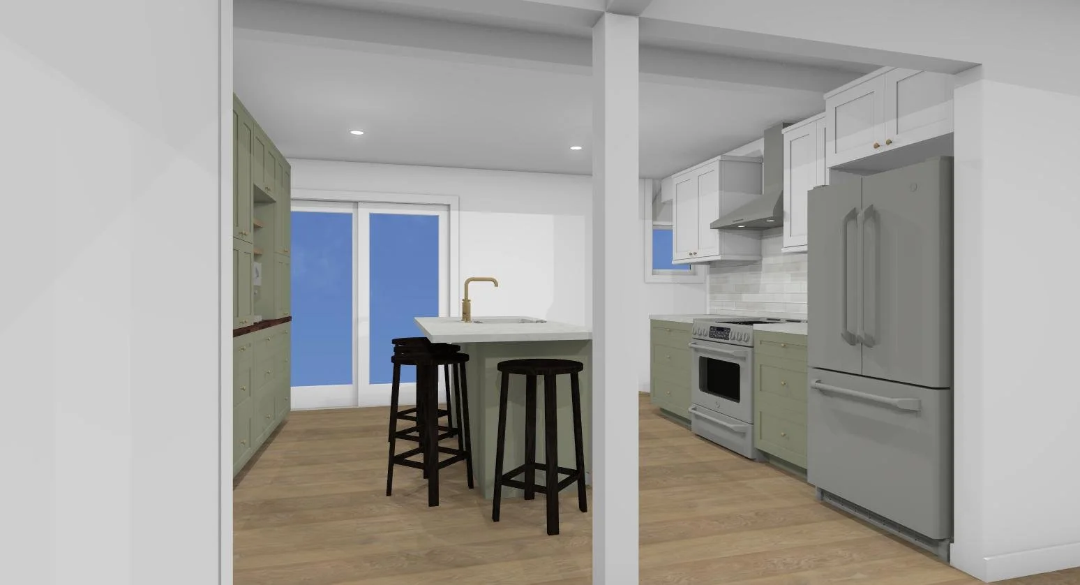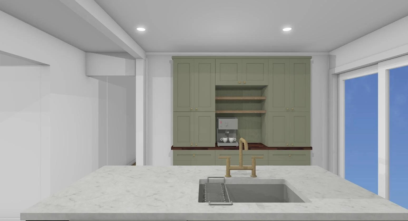 I have shown the kitchen below in the colours we looked at, but we can always change those when we visit Ikea. I have laid out the back coffee bar/pantry area in a few different ways. We also have enough room for some stools on the back of the island, which is nice for a young family and creates more counter space around the sink.