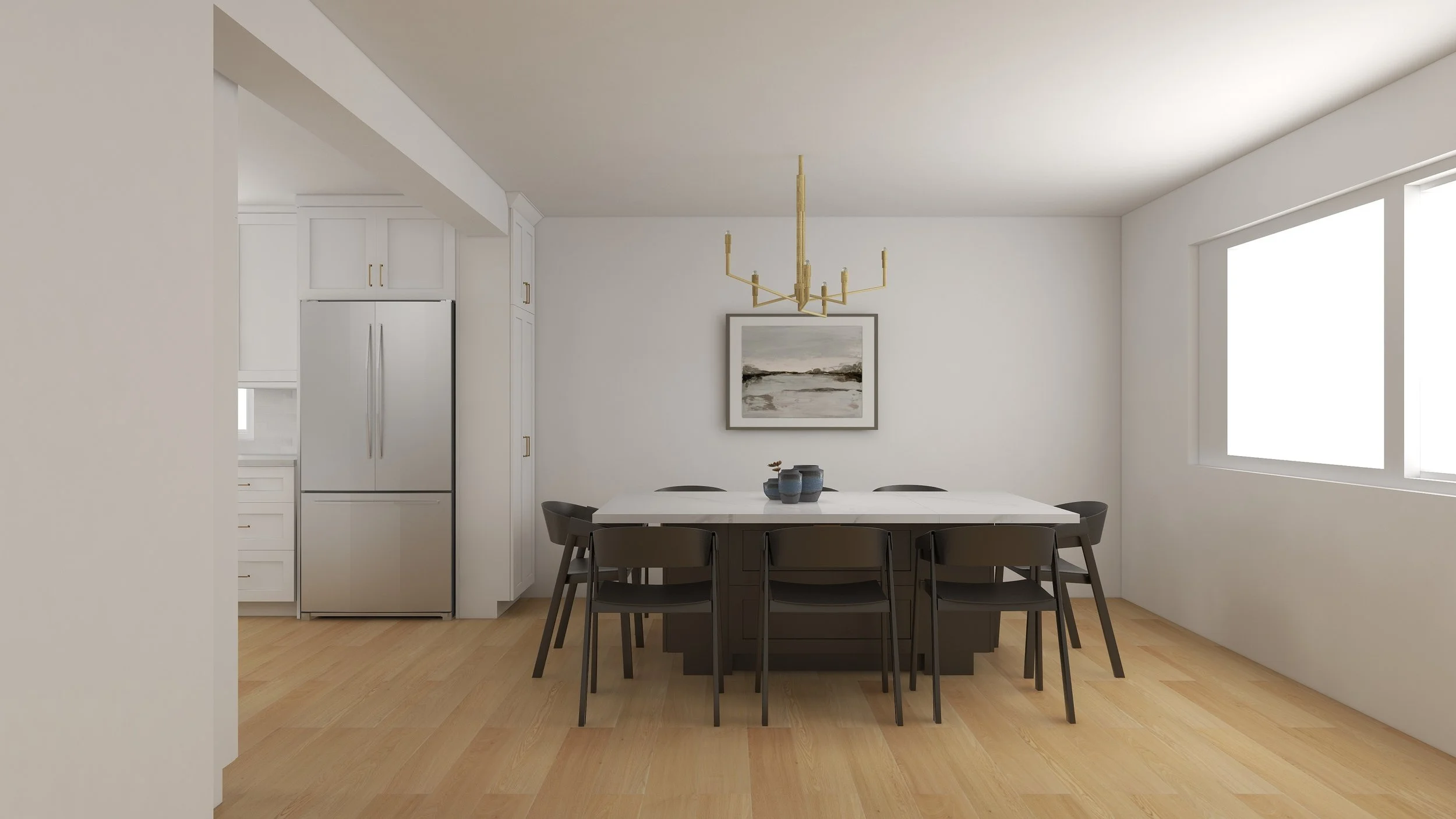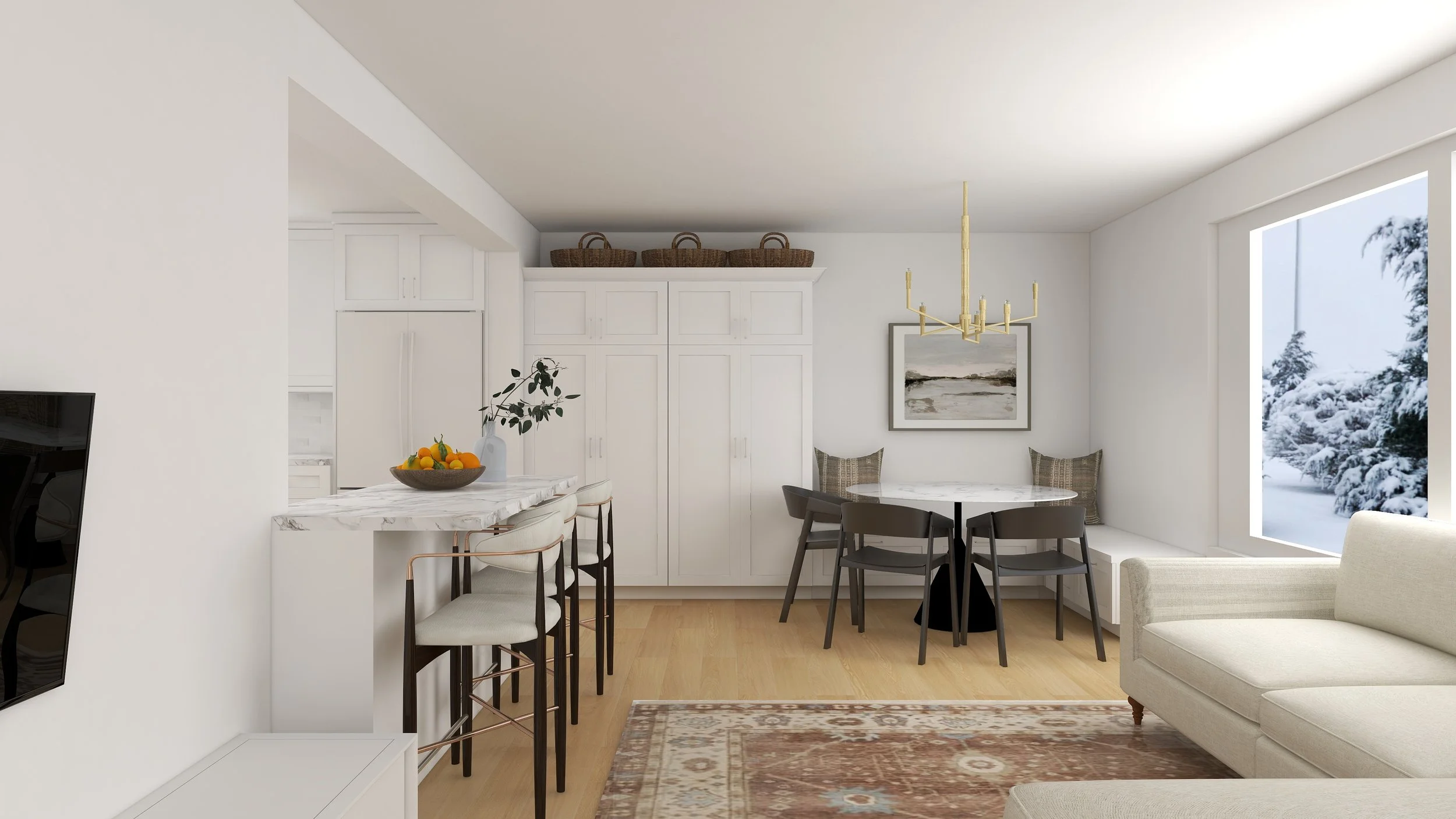 This option has a built-in banquette going on your dining room wall with two full-sized pantries. A small island with seating is added to the kitchen for extra counter space.