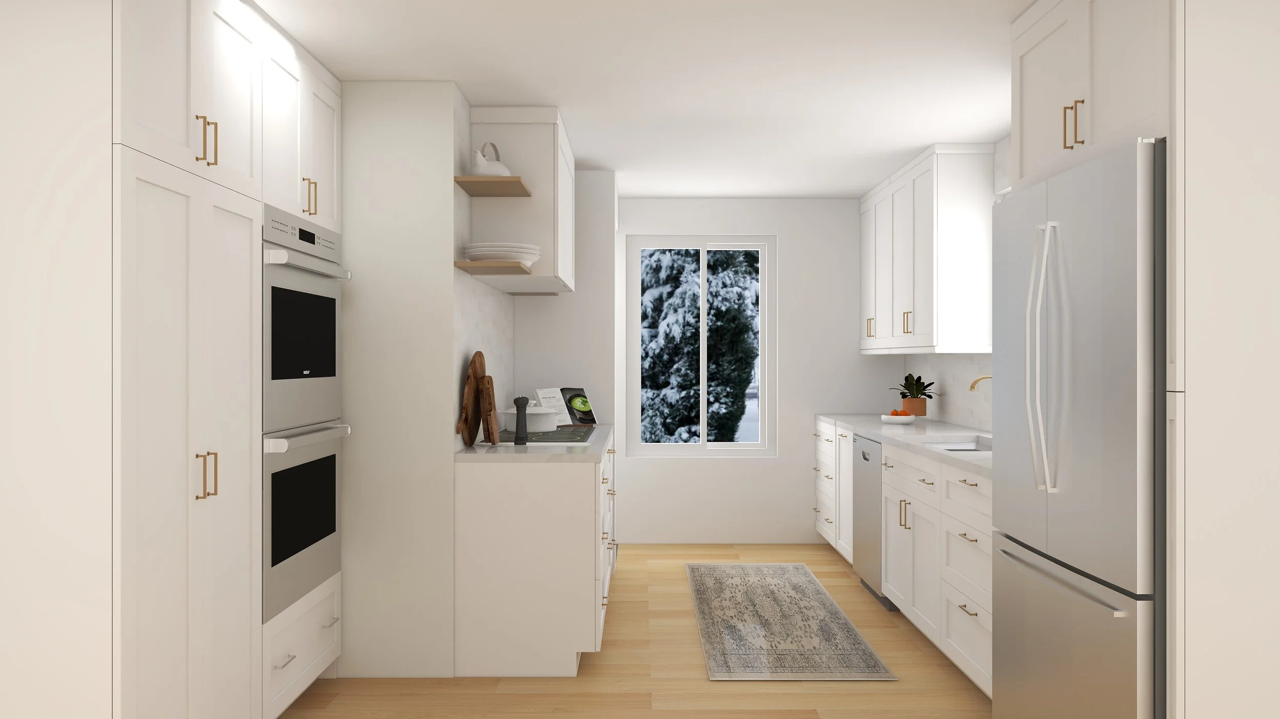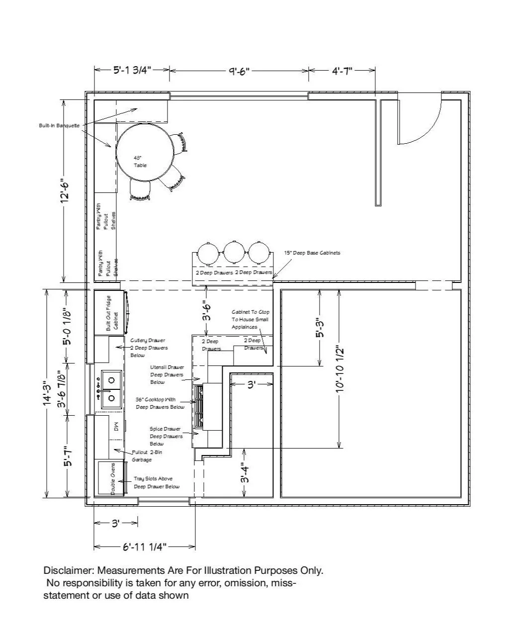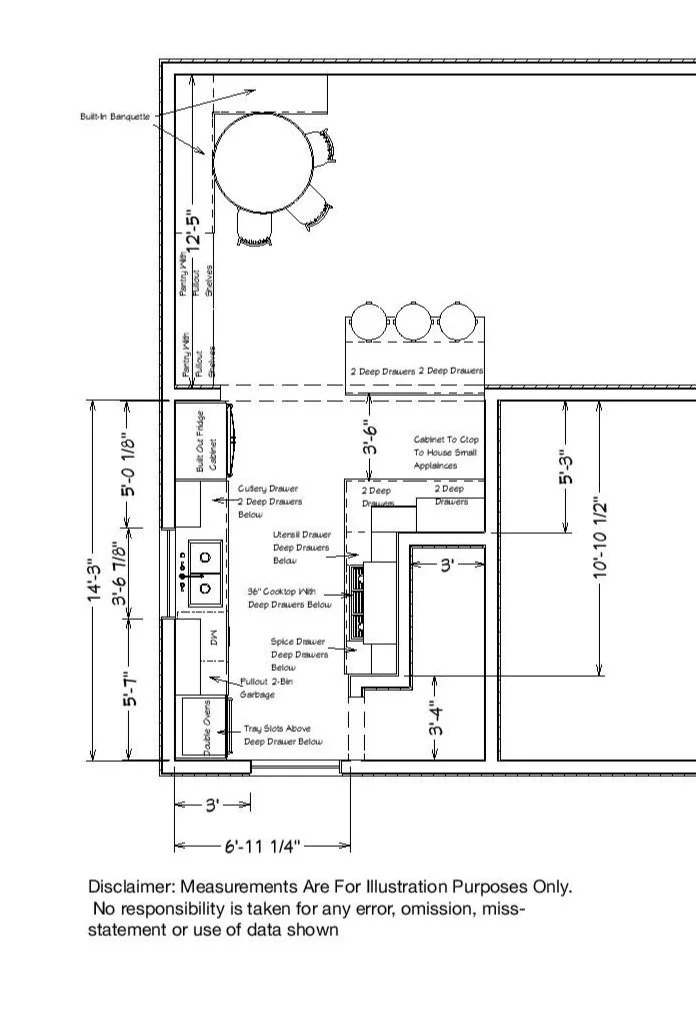 This option has a corner banquette, if you like this option I will pop back over to measure that area to account for when the window starts. The cabinets and open shelves wrap around the corner wall which moves the island out into the dining room which makes it feel like one large space.