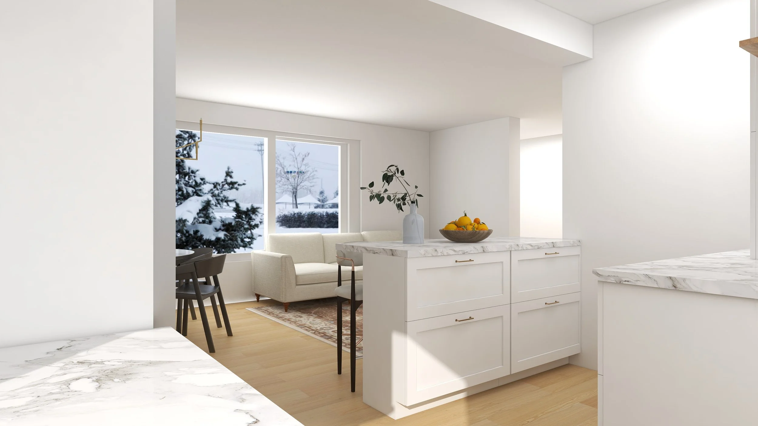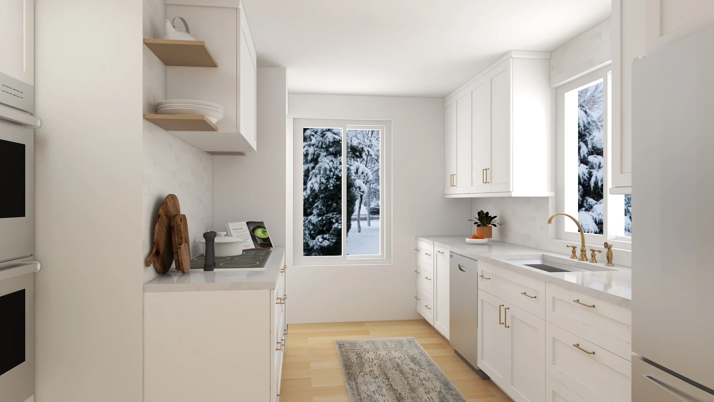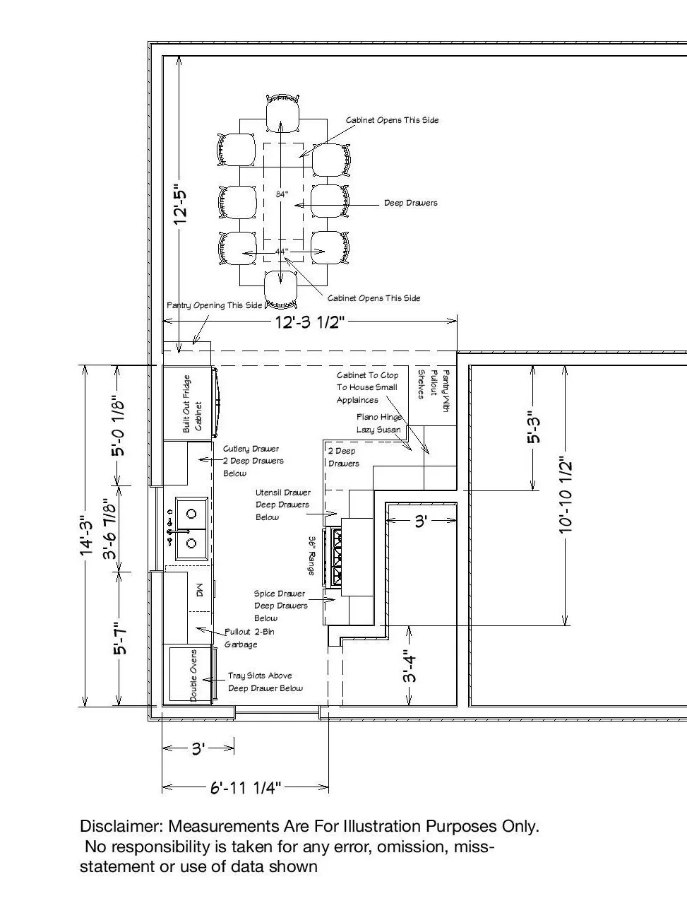 This option has a corner banquette, if you like this option I will pop back over to measure that area to account for when the window starts. The cabinets and open shelves wrap around the corner wall which moves the island out into the dining room which makes it feel like one large space.