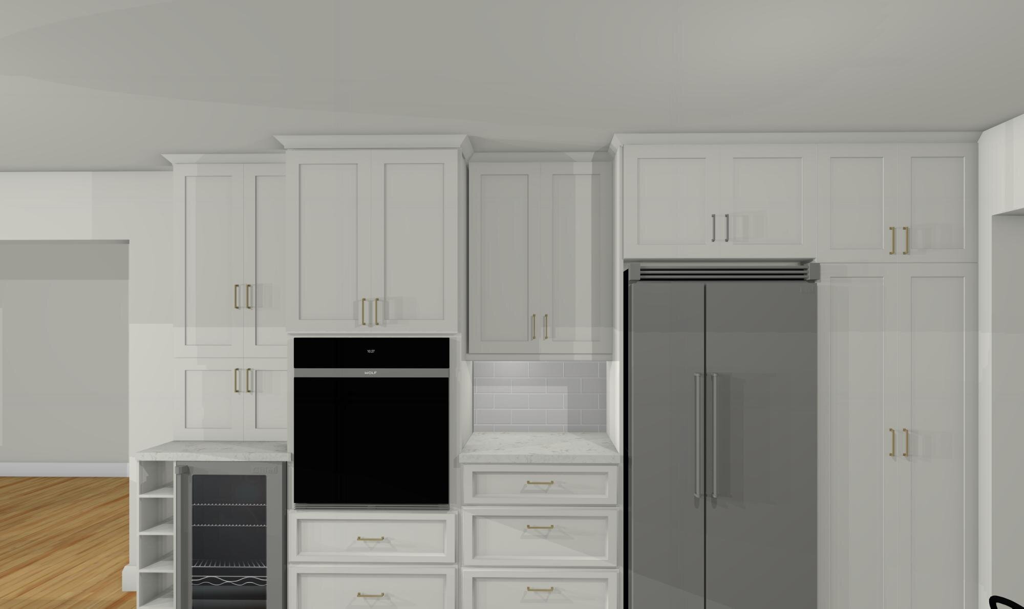 This option has an island that extends into the fireplace area and makes the two spaces become one. I started the island further down so that you have enough room to open the appliances while someone can walk through at the same time. I have added in the bulkheads into both options but we can remove them if there isn’t plumbing in there and extend the cabinets to the ceiling. For the small wall at the end, I have added a desk and wine/coffee bar station area. Under the large window I did add deep drawers cabinets with an upholstered seat. I thought this could be used for when you are entertaining as extra seating.
